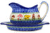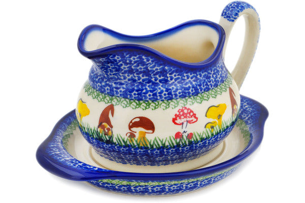 Polish Pottery Gravy Boat with Saucer Mushroom Garden Theme