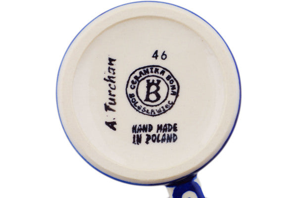 This Polish Pottery 13 oz Mug Blue Eyes Queen Theme was handmade and handpainted by the Ceramika Bona factory in Boleslawiec, Poland by skilled artisans according to old traditional methods. Polish Pottery is superb quality stoneware. Oven, microwave, dishwasher, and freezer safe. Lead and Cadmium free paints and glazes. Resists chips and breakage. Individually handmade and hand painted. It is part of the Blue Eyes Queen Collection.
